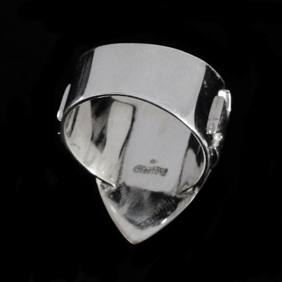 Deze herenring, vervaardigd in sterling zilver, heeft een Tempeliers- of Kruisvaardersmotief. Hij is volledig met de hand gebeiteld, niet gegoten. De ring is versierd met een schild met een kruis van rood koraal en een Maltezer kruis, beide aan weerszijden gegraveerd.