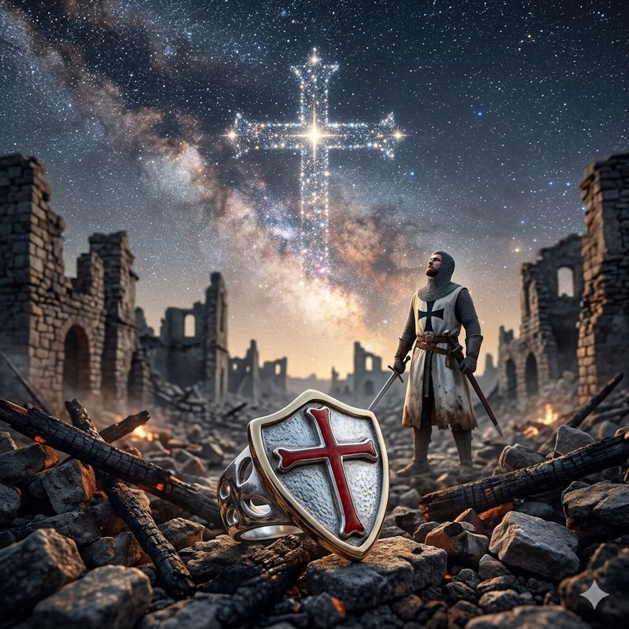 De middeleeuwse ring van de Tempel en Malta in zilver is een symbolisch sieraad, gemaakt van 925 sterling zilver, dat de emblemen van twee beroemde historische ordes combineert: de Orde van de Tempel, de Tempeliers, en de Orde van Malta, de Hospitaalridders.