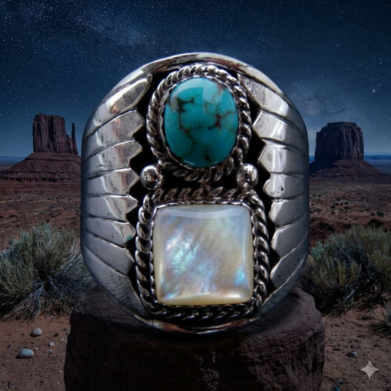 Navajo-ringen van turkoois en koraal zijn iconische handgemaakte sieraden uit het Amerikaanse Zuidwesten. Ze combineren vaak traditionele, uitgesneden ontwerpen met natuurstenen en de blauwgroene kleur van turkoois met het karmozijnrood van koraal. Deze ringen worden gewaardeerd om hun culturele betekenis en kwaliteit.