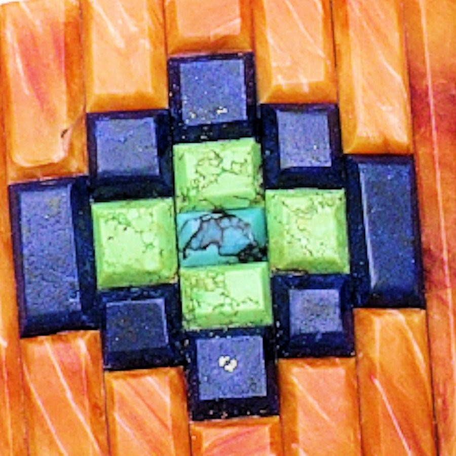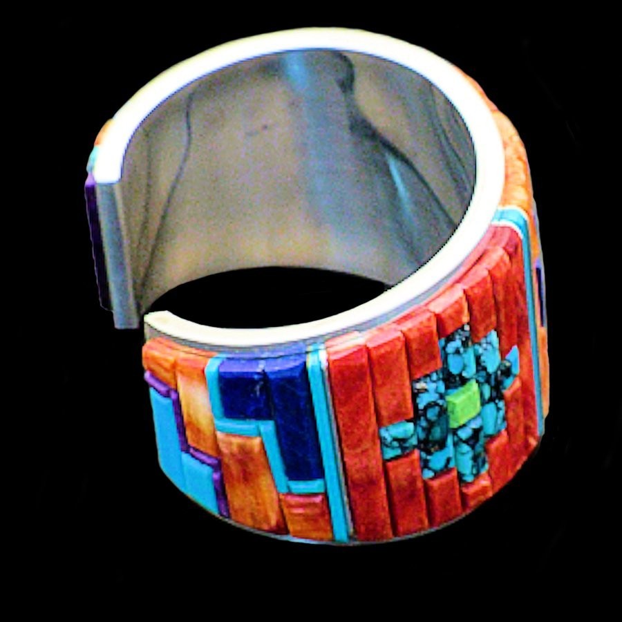 Sterling Zilver/925 armband bezet met veelkleurige stenen en vertegenwoordigende Navajo symbolen.