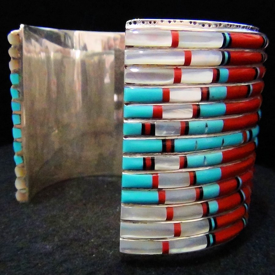 Sterling/925 zilveren armband bezet met turkoois, parelmoer en bloedkoraal.