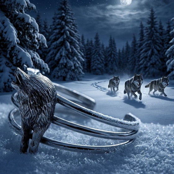 Deze armband, geïnspireerd op de inheemse Amerikaanse cultuur of totems, heeft een band van 925 sterling zilver met gegraveerde wolfmotieven, met in het midden een cabochon geslepen edelsteen. De armband is geschikt voor zowel mannen als vrouwen en is verstelbaar in breedte.