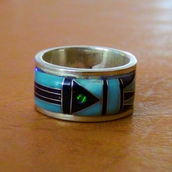 Navajo/925 Sterling Zilveren ring voor Dames of Heren bezet met Turkoois, Jeais, Opaal, vertegenwoordigend een pijl, Indiaas symbool - Breedte 1 cm - Gewicht 7 g.