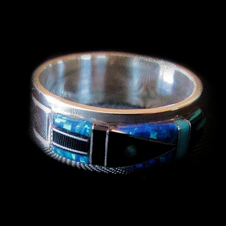 Navajo zilveren ring voor vrouw of man bezet met jeais en opaal die een pijl voorstellen, Indiaas symbool. Breedte: 1 cm.