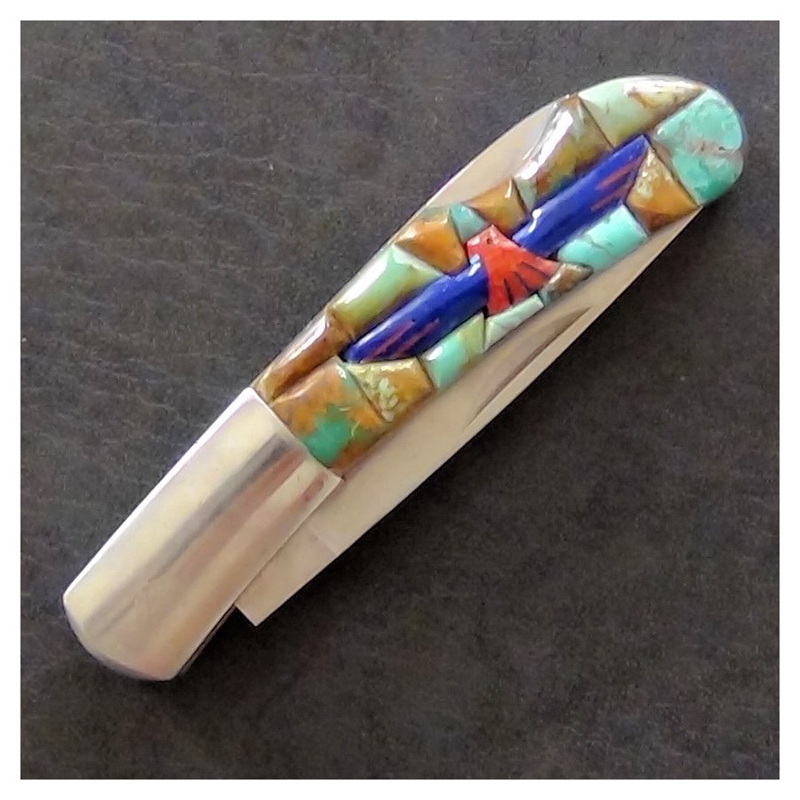Zakmes waarvan het handvat is bezet met Turkoois en een Thunderbird.