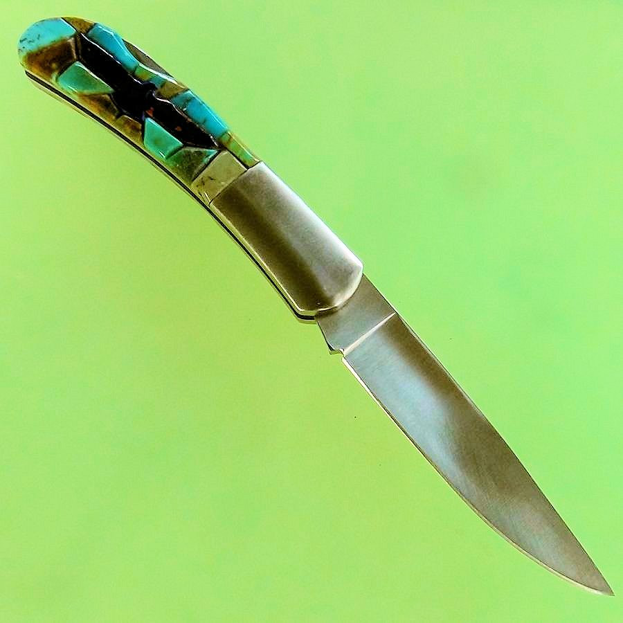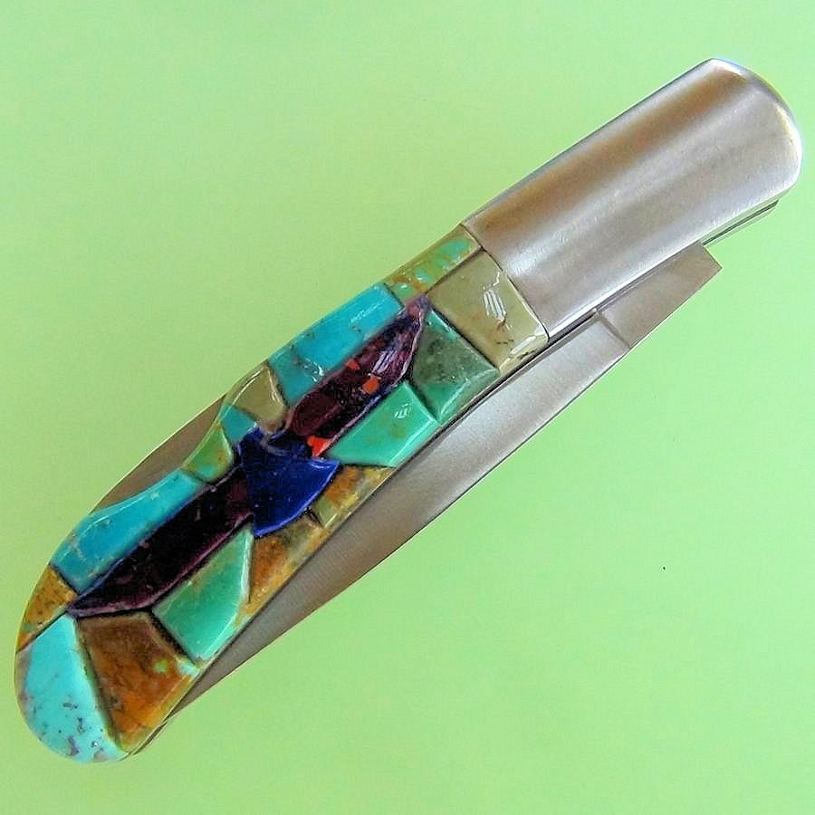 Zakmes waarvan het handvat is bezet met Turkoois en een Thunderbird.