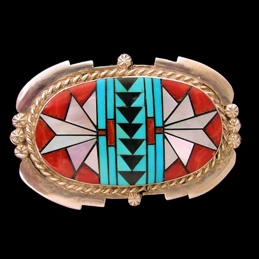 Broche van Sterling/925 zilver, die een Navajo-motief voorstelt, bezet met koraal, parelmoer en fijn met de hand gebeiteld turkoois.