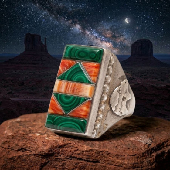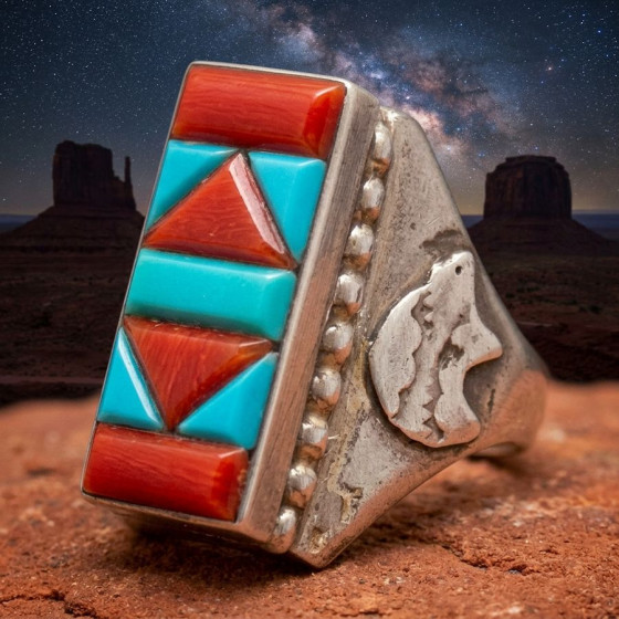 Sterling zilver (925) bezet met turkoois en onyx, met aan weerszijden een reliëf van een heilige beer.