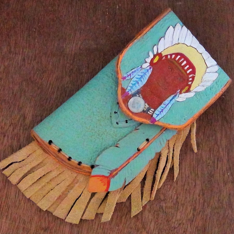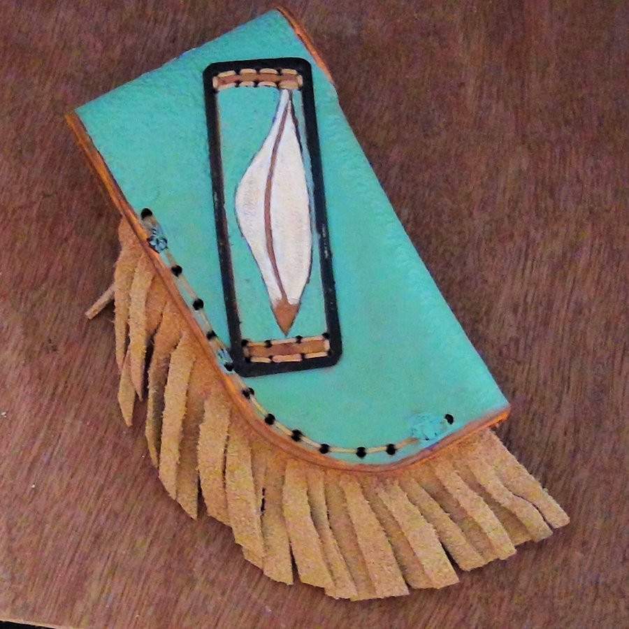 Reliëf en met de hand beschilderd lederen schede voor een mes van maximaal 11,5 cm.