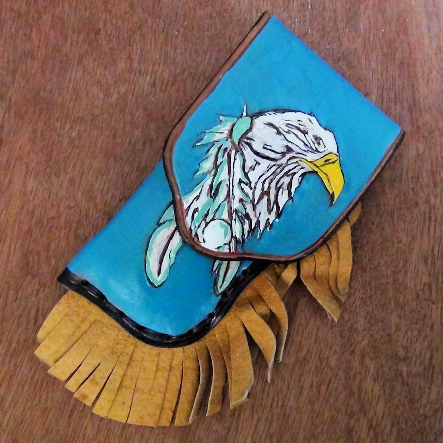 In reliëf gemaakte en met de hand beschilderde lederen schede voor mes Model 3 van onze site